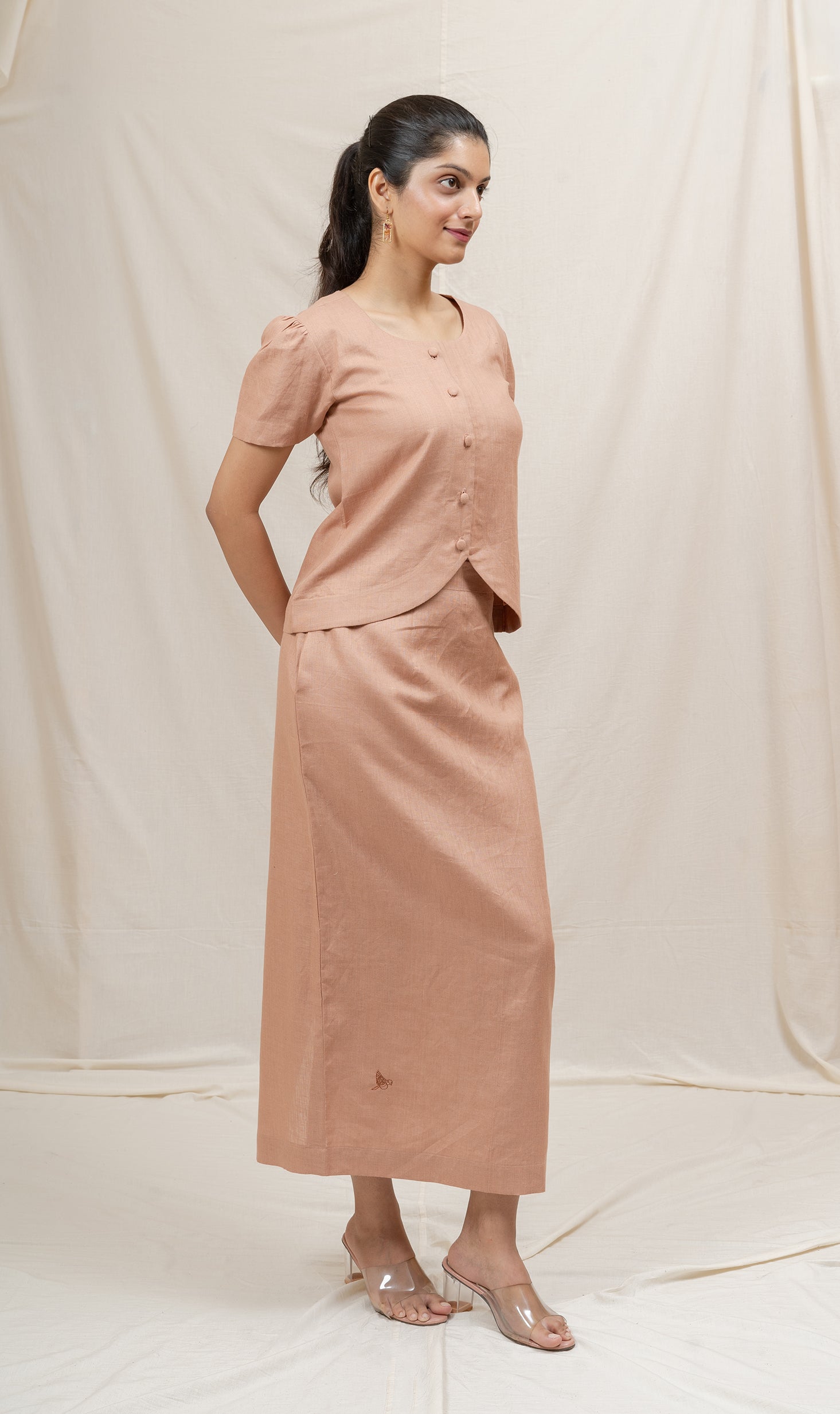 Paired with an A-line skirt featuring a back zipper and hook closure