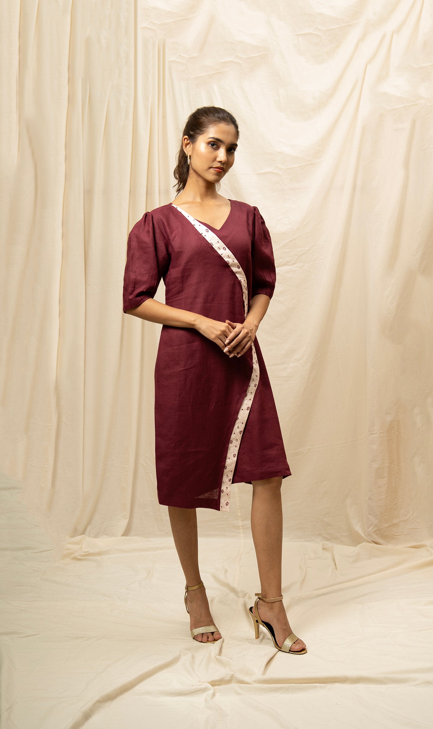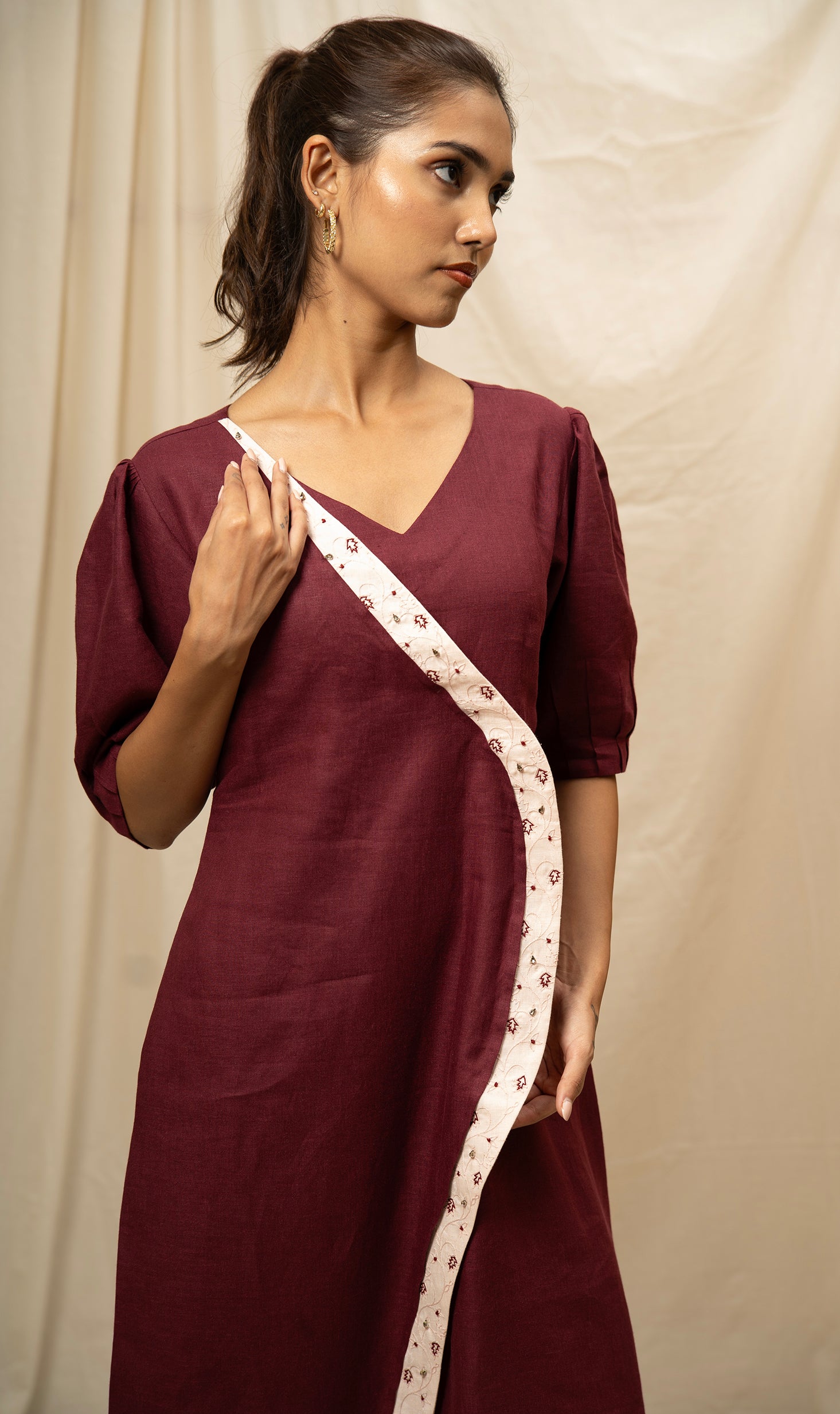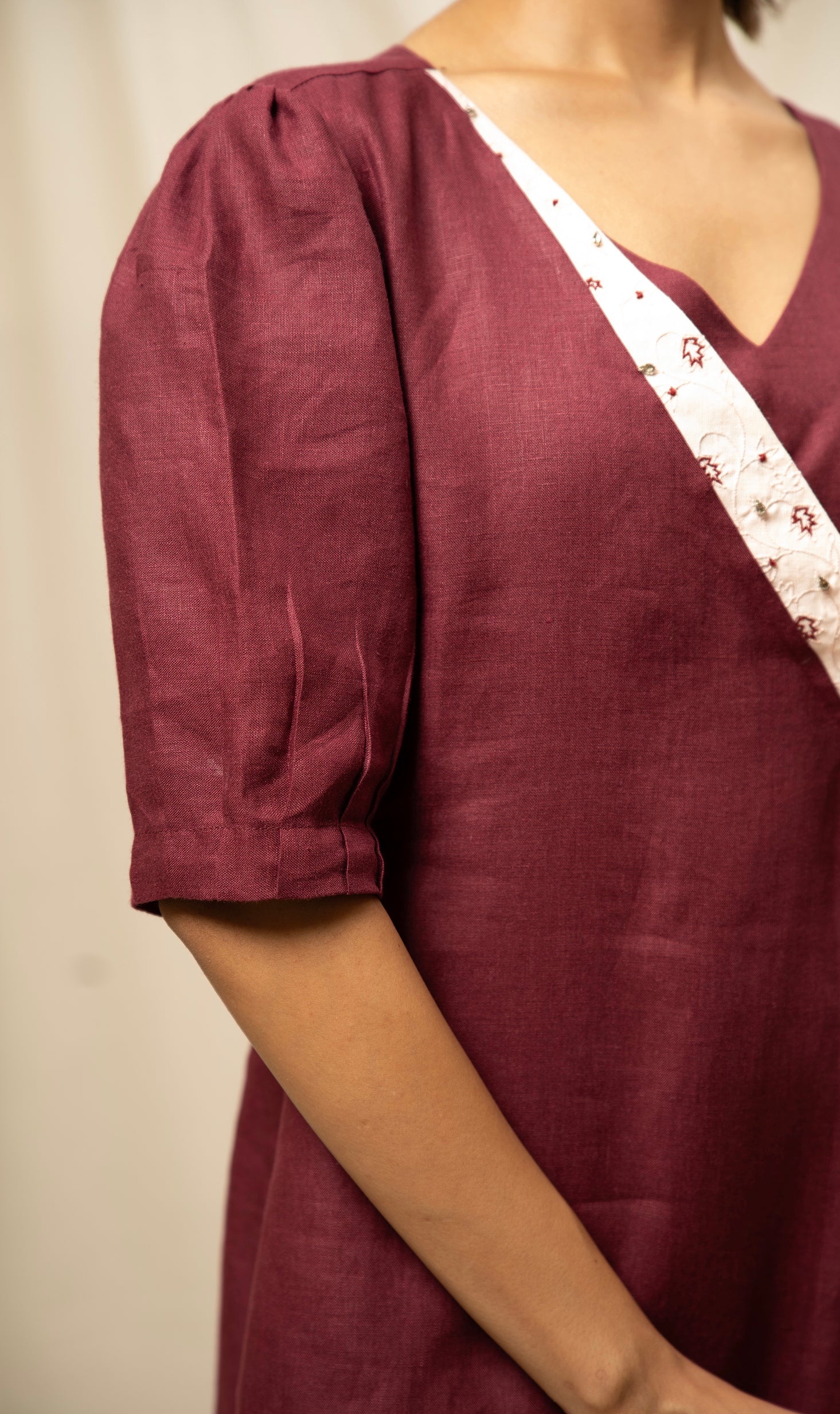 Features three-quarter bell sleeves adorned with subtle embroidery detail