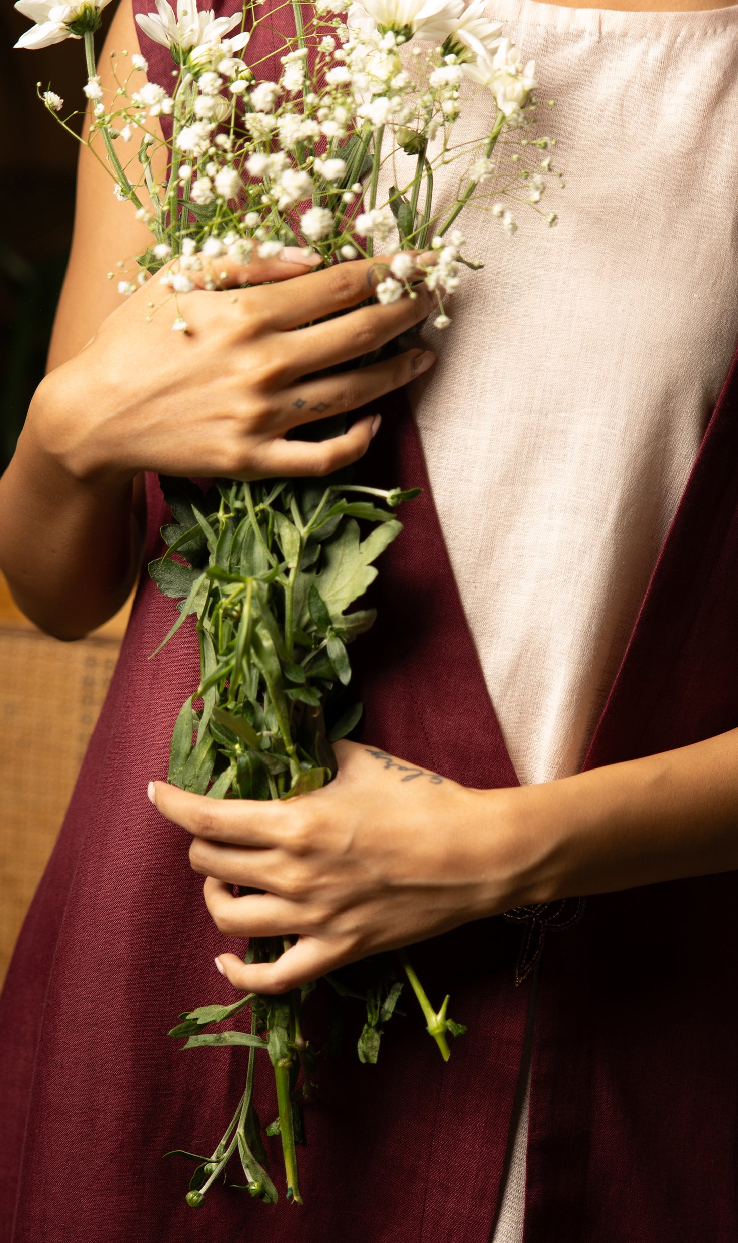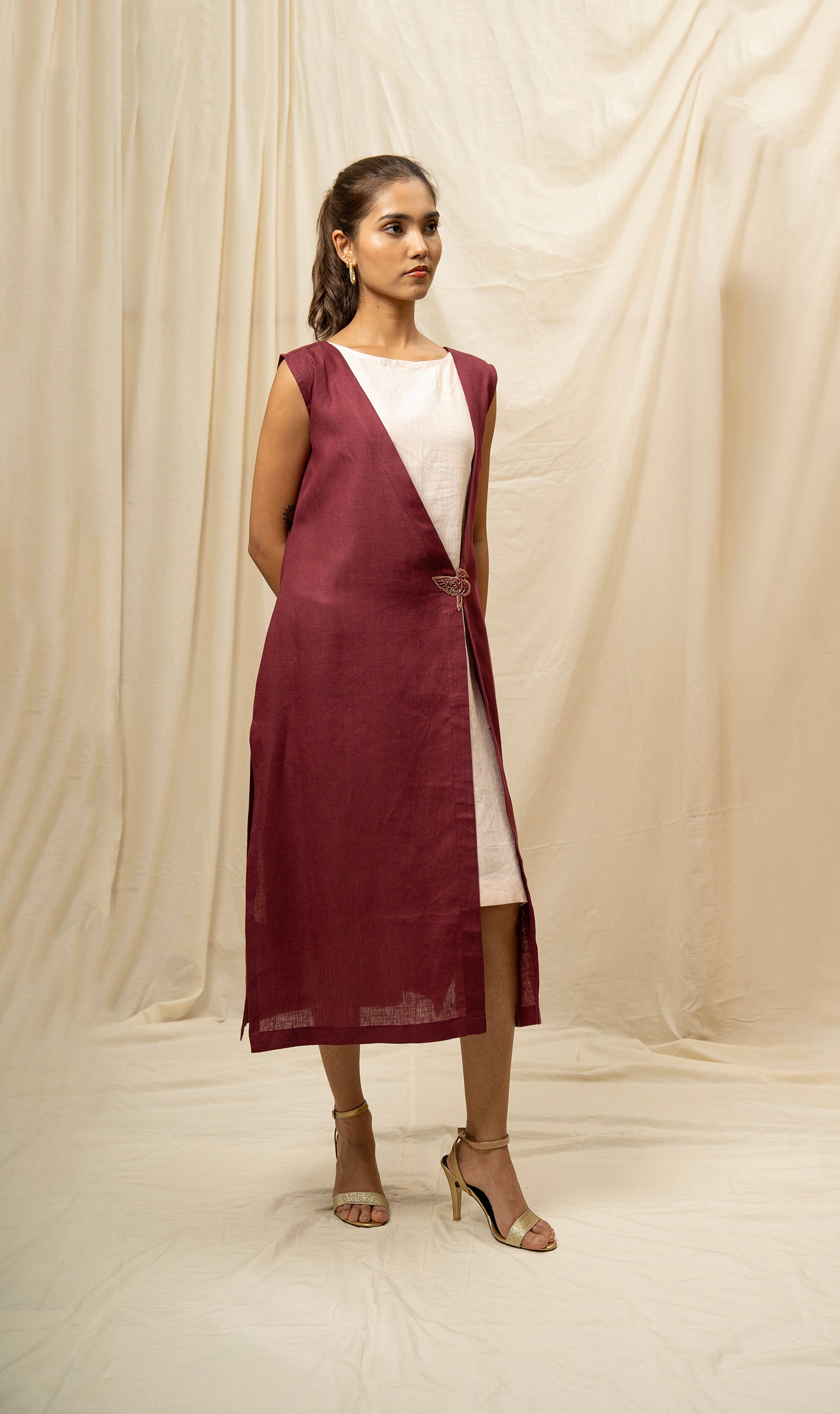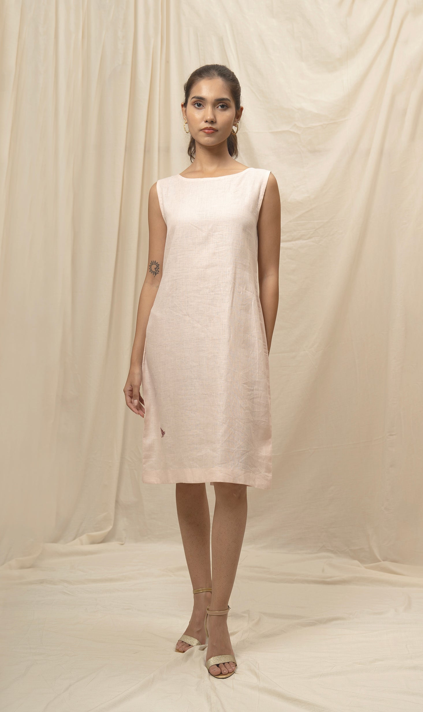 Features an asymmetrical overlay neckline adorned with delicate dove embroidery