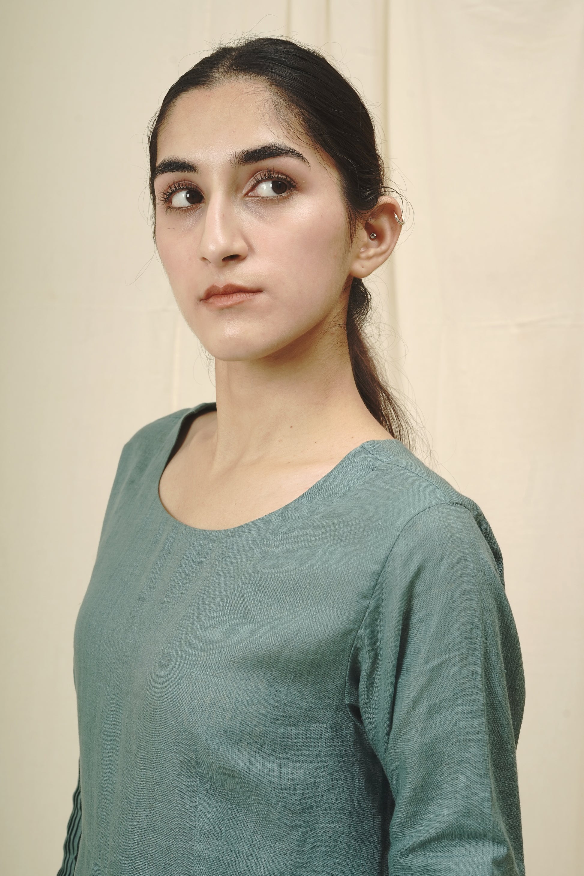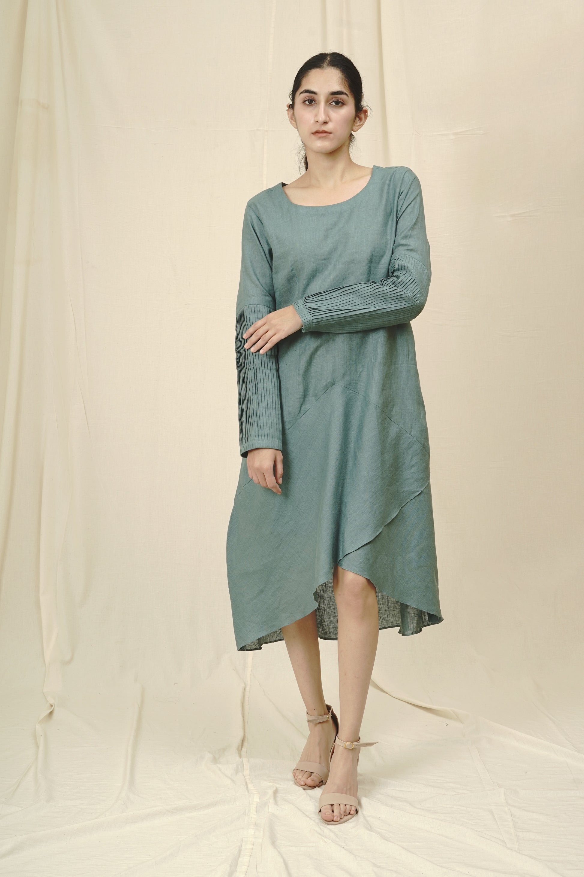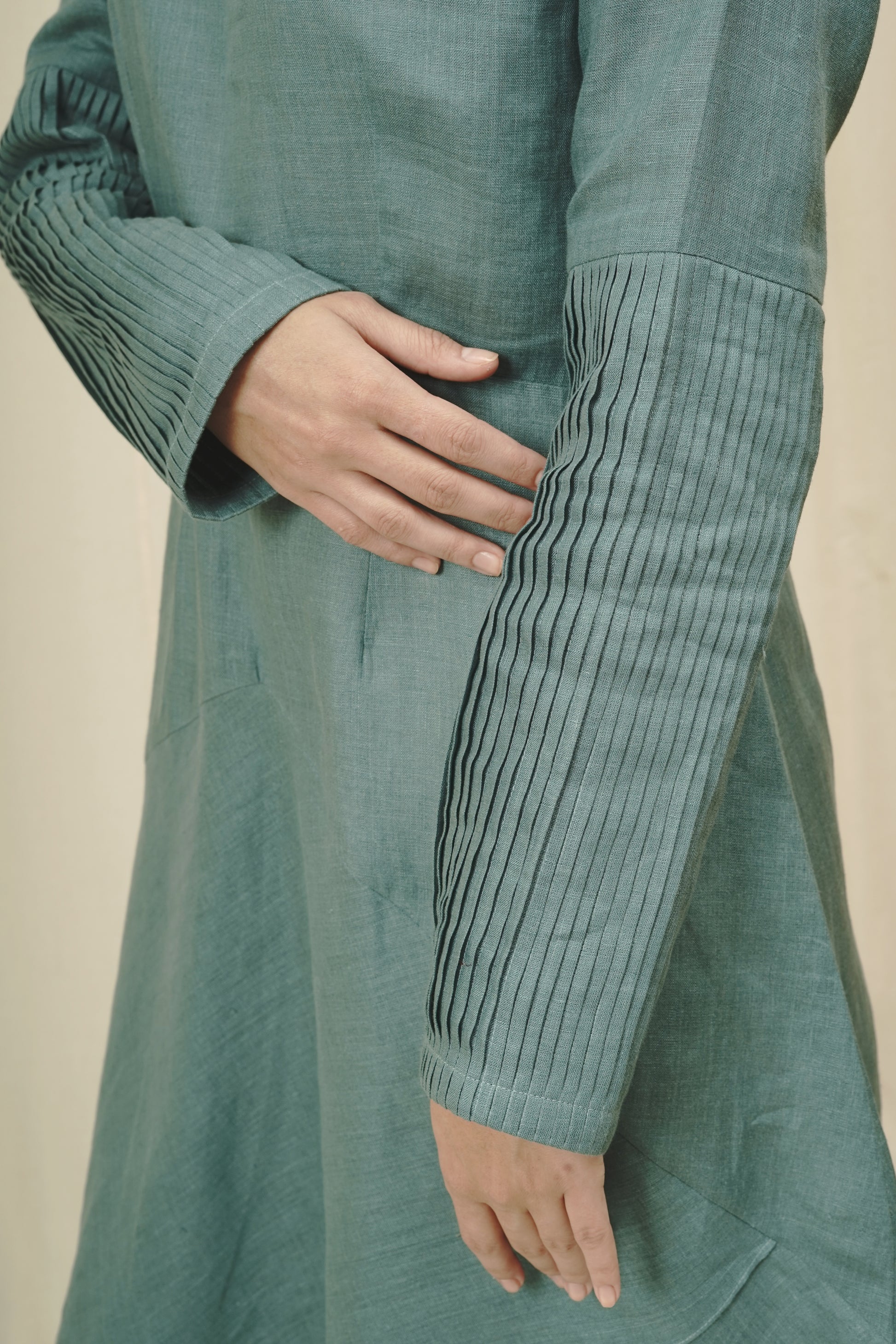 Features a round neckline and full sleeves with pleat detailing for added elegance.