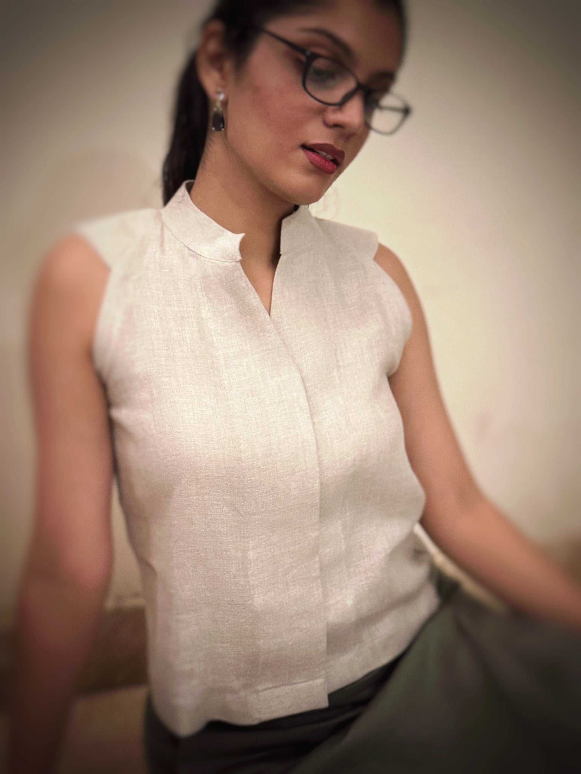 Short sleeveless button-down top with concealed placket