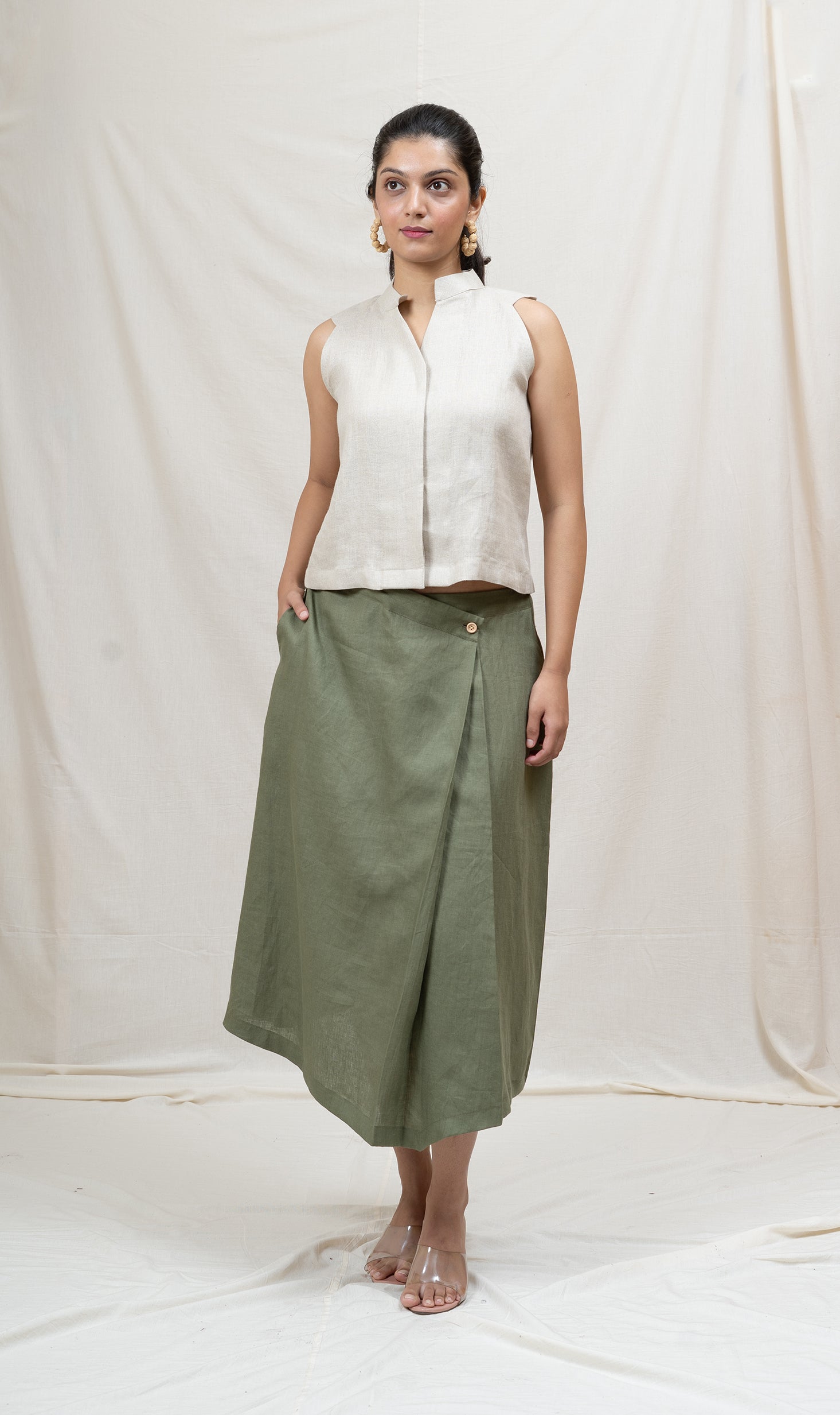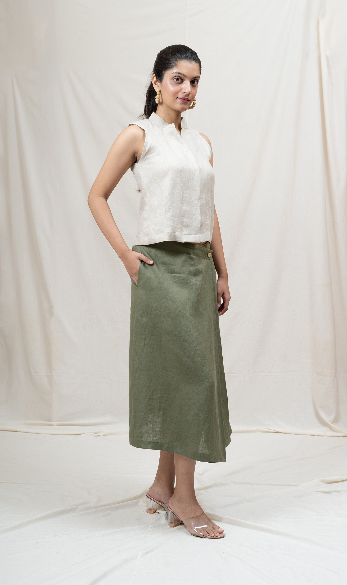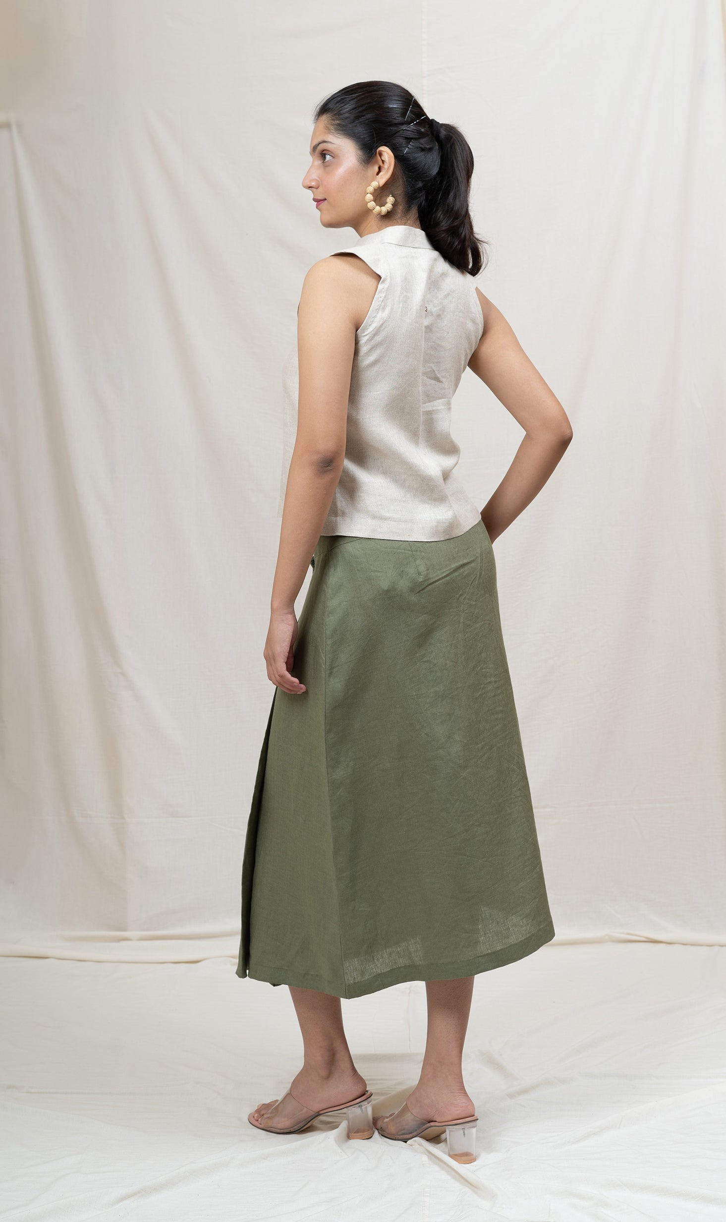 Paired with a mid-length skirt featuring a fully belted waist