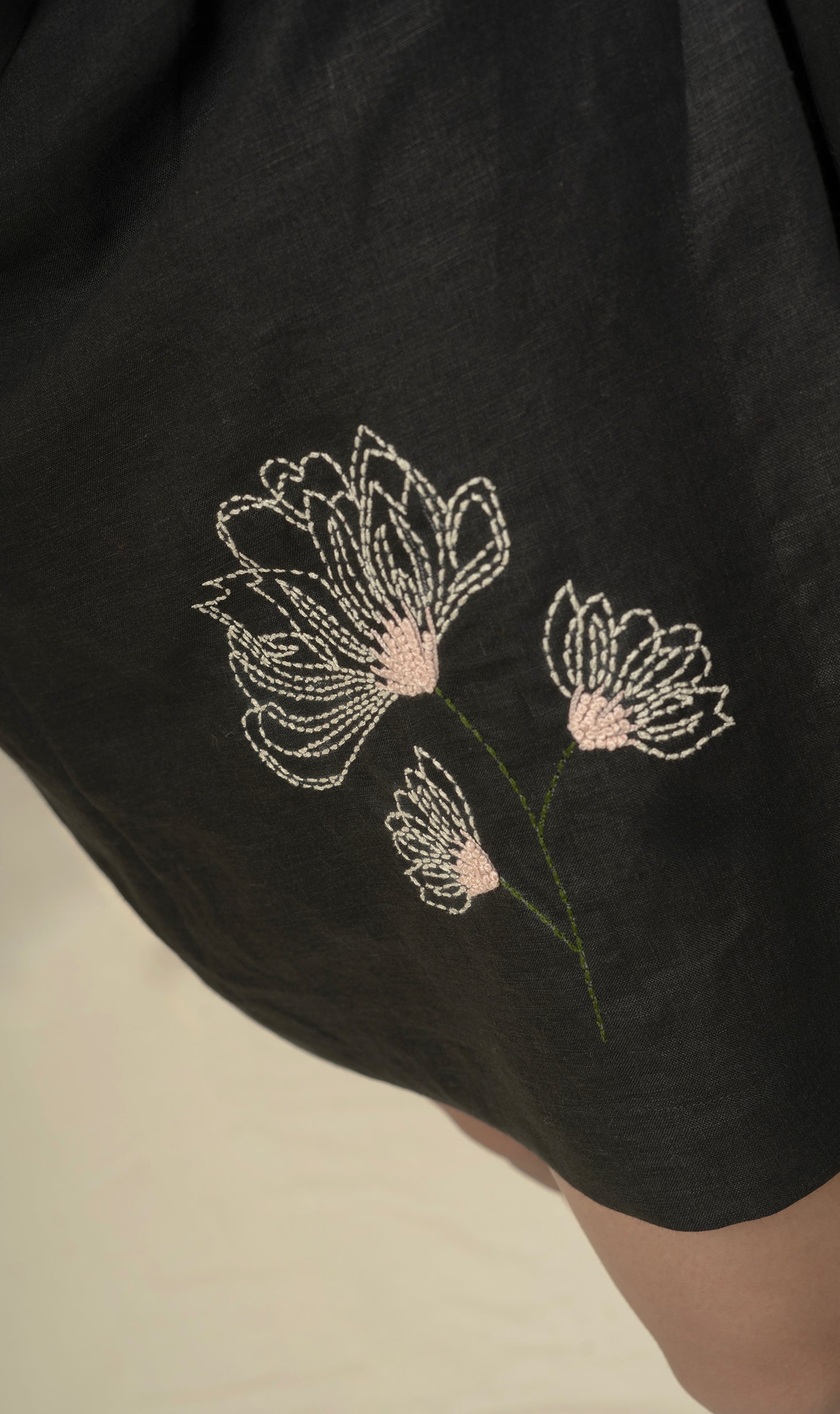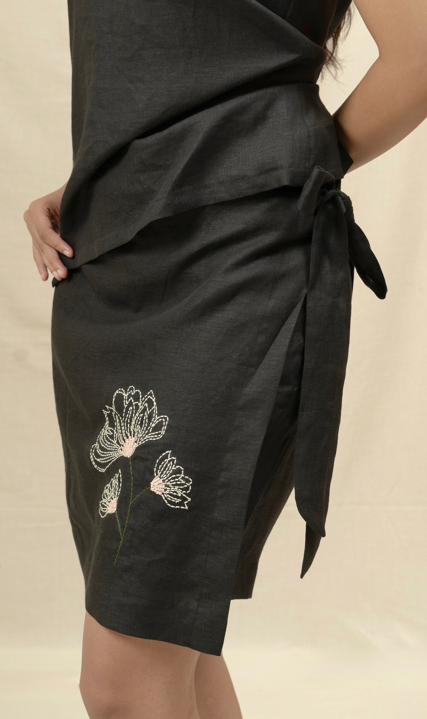 Paired with an elasticated and belted waist skort featuring bow tie and embroidery detail